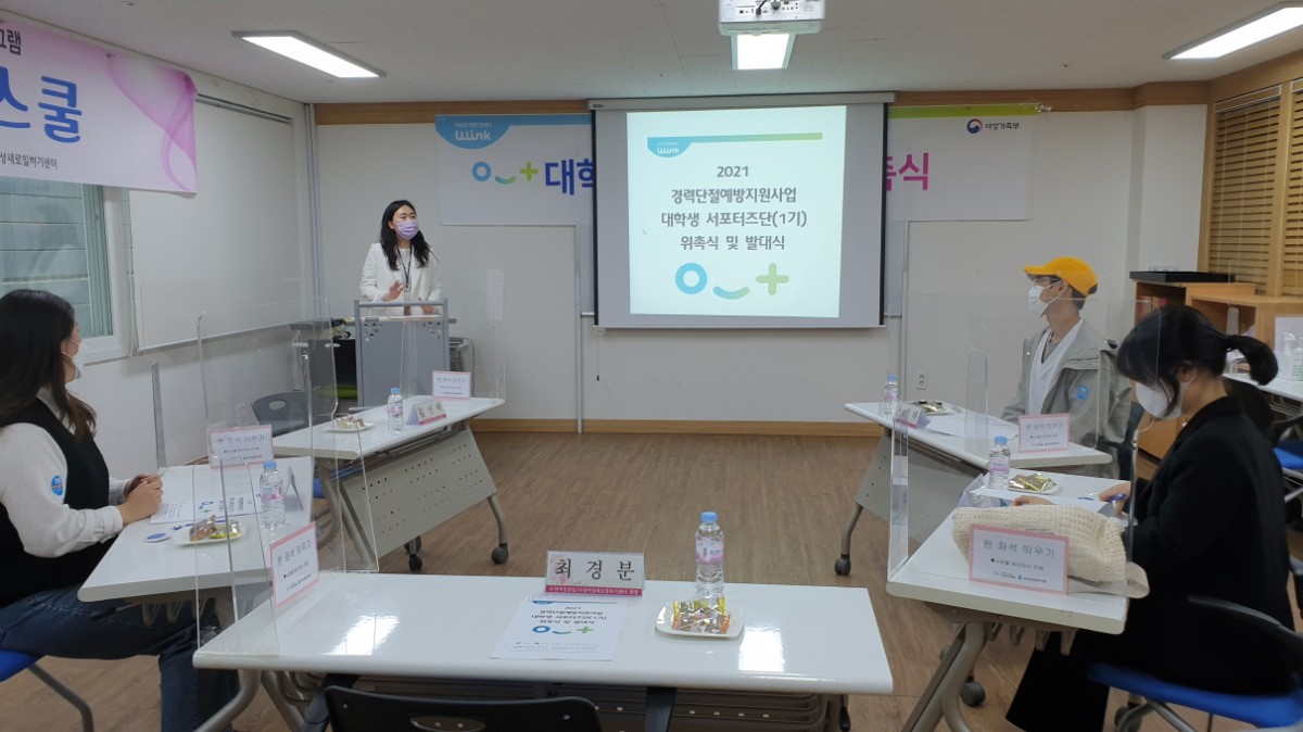 [2021. 4. 28.] 대학생서포터즈단 위촉식 본문 경력단절예방사업의 대학생서포터즈단 위촉식 및 교육을 수성새일 교육장에서 진행하였습니다. 페이스북 공유 트위터 공유 구글+ 공유 목록 이전글[2021. 4. 26.] 여성친화도시 간담회 개최 21.05.06 다음글[2021. 4. 27.] 간호조무사 재취업 양성과정 수료식 21.04.29 댓글목록 댓글목록 등록된 댓글이 없습니다.
