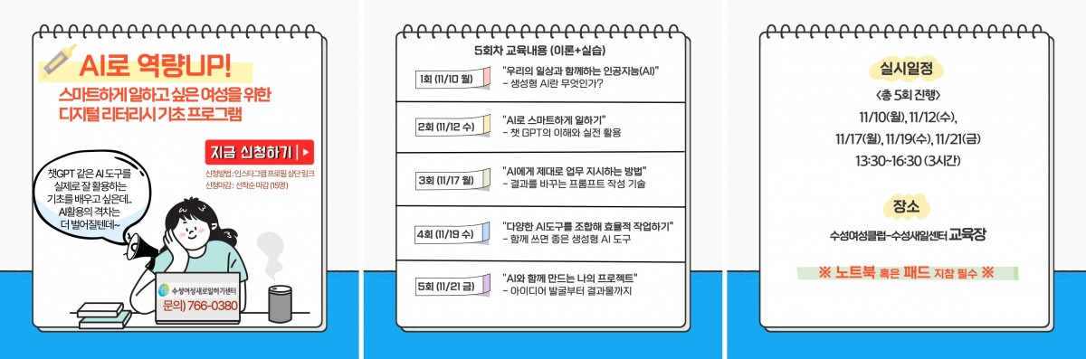 [수성새일] 디지털 리터러시 기초프로그램 교육신청( 선착순 마감 : 15명) 페이지 정보 본문 디지털 리터러시 교육 신청 폼 https://naver.me/5tfD9btl 페이스북 공유 트위터 공유 구글+ 공유 다음글[수성대학교] 글로컬마케터리더 양성과정&웹소설IP창작자 양성과정 교육생 모집 목록 댓글목록 0 댓글목록 등록된 댓글이 없습니다.